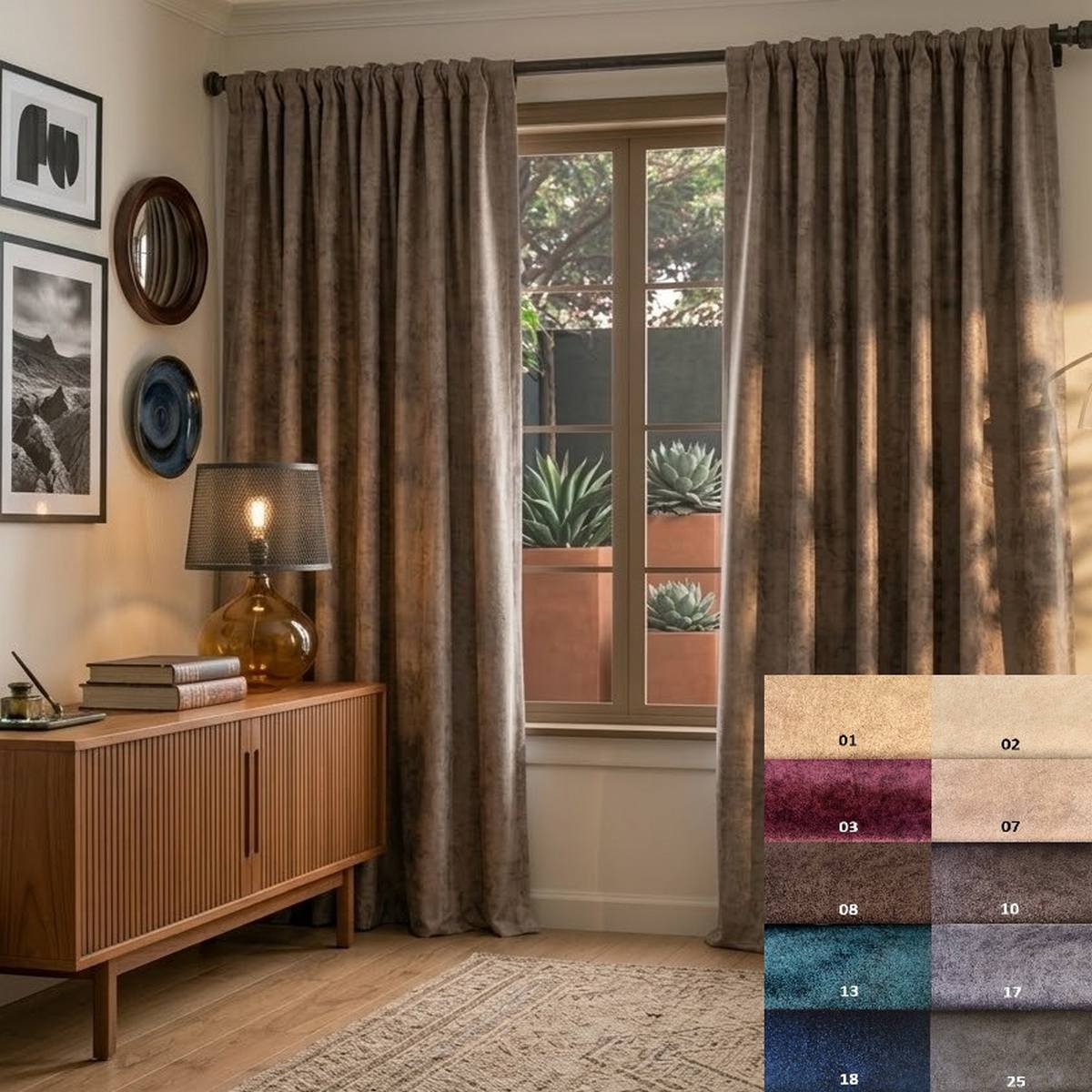 Die Vorhänge bestehen aus einer doppelten Lage und sind in 11 verschiedenen, ansprechenden Farben erhältlich. Das Muster des Vorhangmaterials ist auf den Bildern gut erkennbar und verleiht den Räumen Stil und eine angenehme Atmosphäre.
